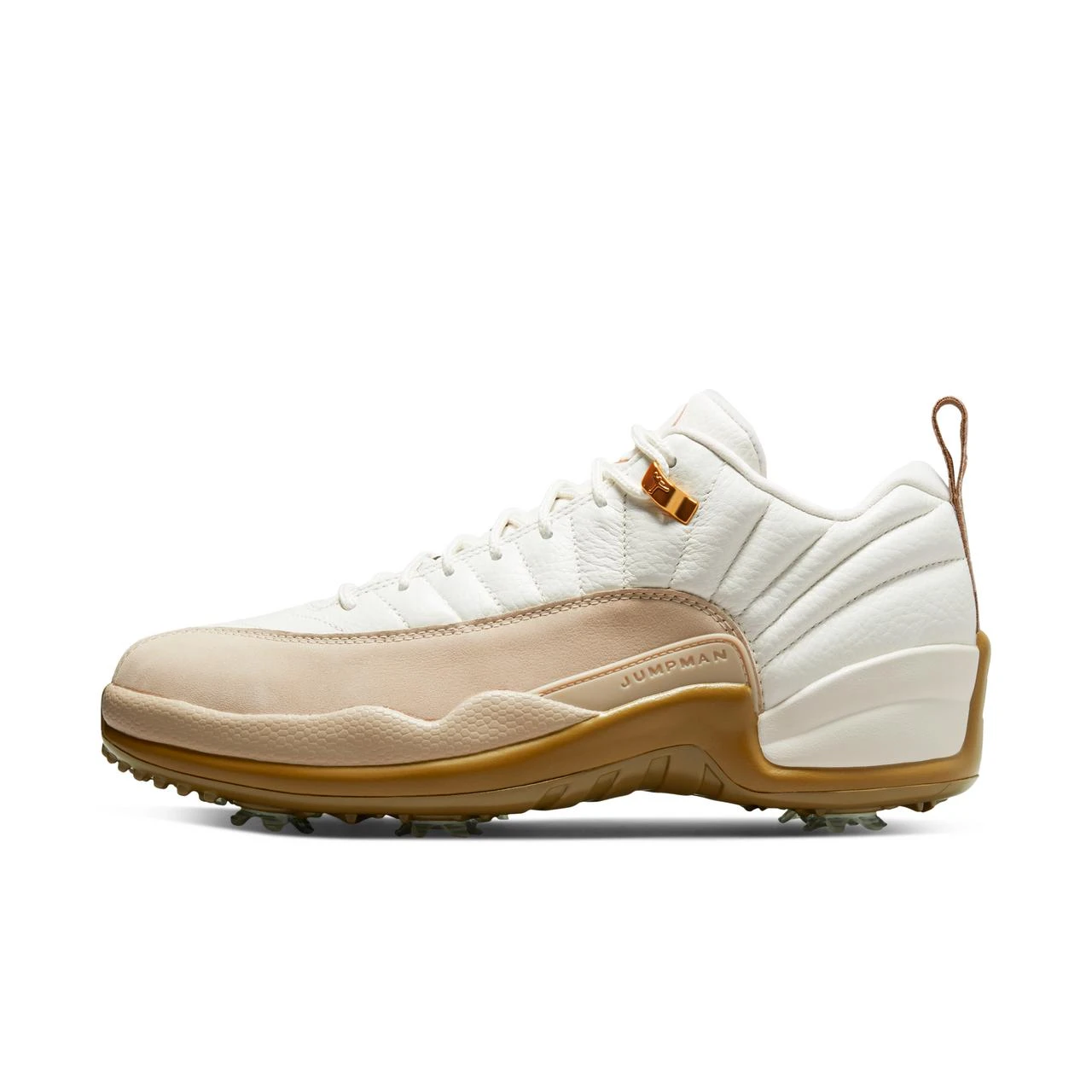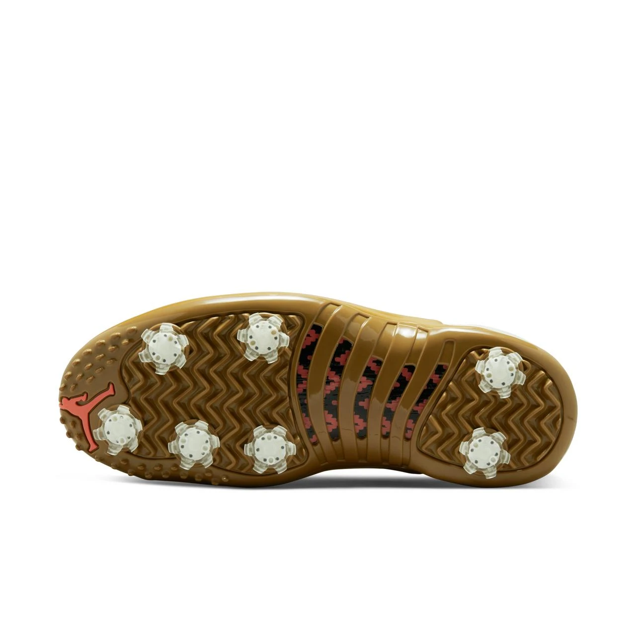 Hybrid outsole combines integrated traction with 7 removable spikes for optimal gripping power. The grooves and ridges surrounding the spikes are inspired by the outsole on the original AJ XII.